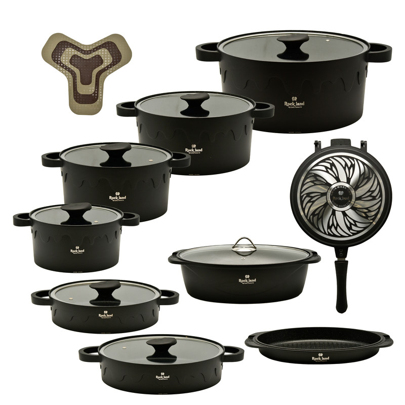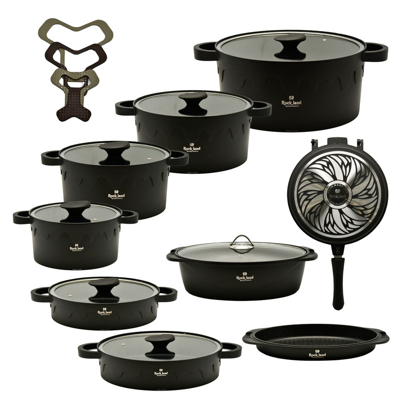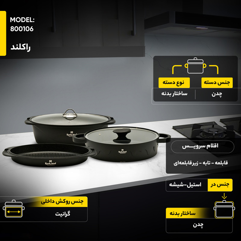 سرویس پخت و پز 21 پارچه راکلند یک مجموعه کامل و جامع است که با تنوع بینظیر ظروف، تمام نیازهای یک آشپزخانه حرفهای و خانگی را برآورده میکند. این سرویس که ساخت کشور ایران است، شامل چهار قابلمه در سایزهای مختلف، چندین تابه دو دسته، یک تابه دوطرفه رژیمی و یک تابه گریل است. اقلام کاربردی دیگری مانند زیرقابلمهای نیز در این مجموعه ۲۱ پارچه گنجانده شده است. ساختار بدنه این ظروف از چدن است که به حفظ و پخش یکنواخت حرارت شهرت دارد و به پخت بهتر و جا افتادن غذا کمک میکند. روکش داخلی تمامی ظروف از جنس گرانیت نچسب است که آشپزی با کمترین میزان روغن را ممکن کرده و شستشوی آنها را بسیار آسان میسازد. از ویژگیهای خاص این سرویس، قابلیت اتصال تابه گریل به تابه عادی همسایز خود است که به شما اجازه میدهد از آنها به عنوان یک تابه دوطرفه بزرگ استفاده کنید. دستههای چدنی این سرویس نیز به صورت یکپارچه با بدنه طراحی شدهاند. در نهایت، سرویس پخت و پز راکلند برای جهیزیه یا آشپزخانههایی که به دنبال یک مجموعه کامل و همهکاره هستند، یک انتخاب بینظیر است.