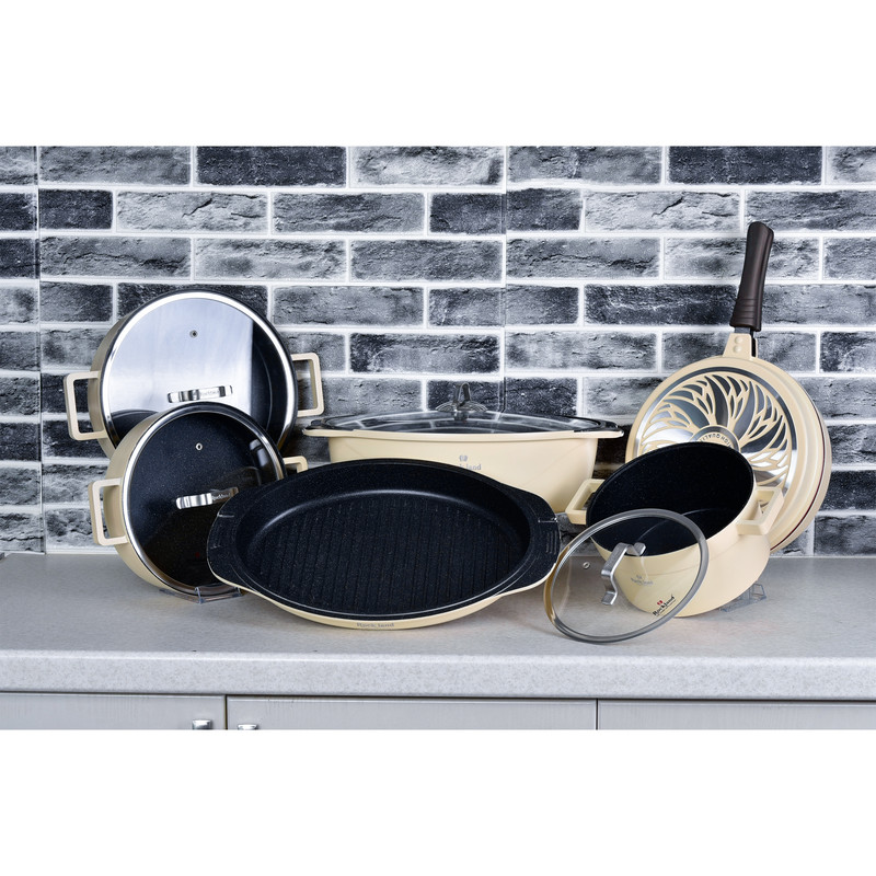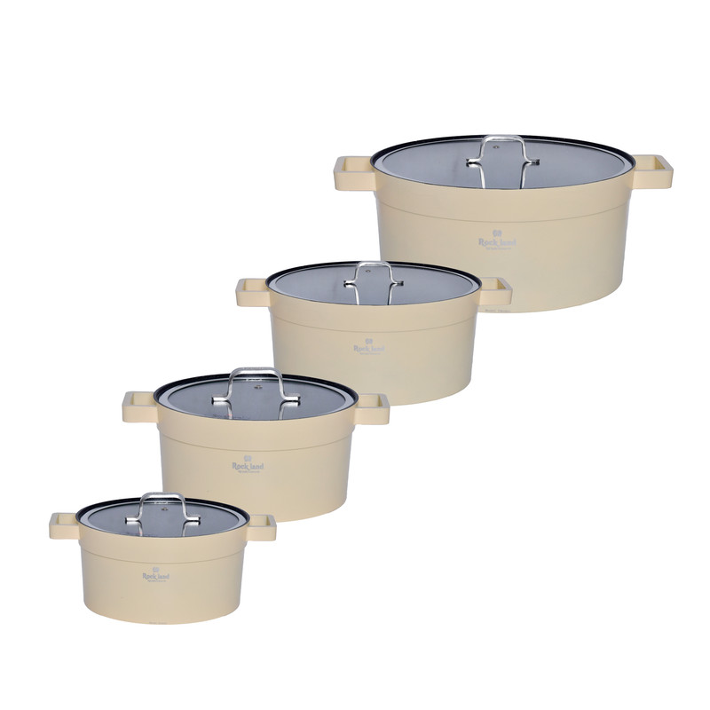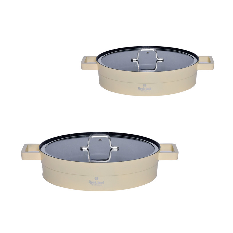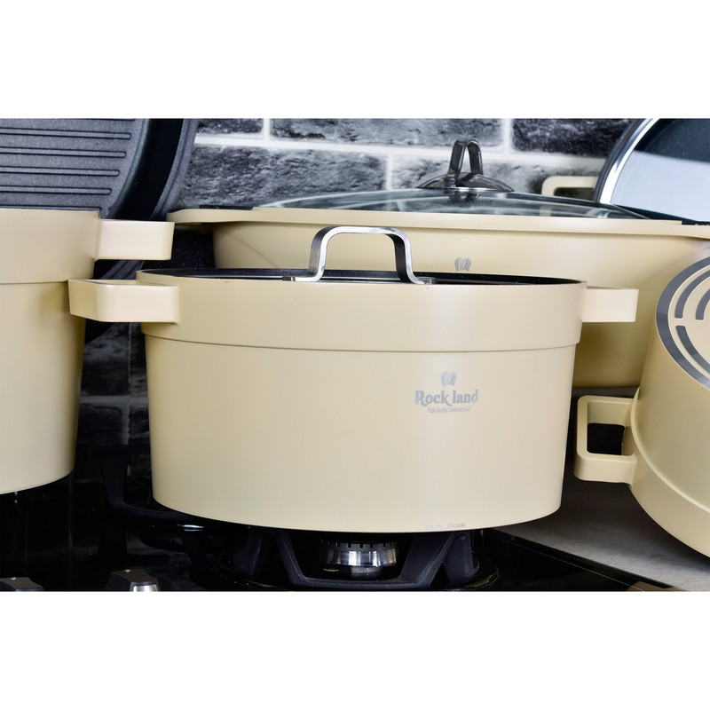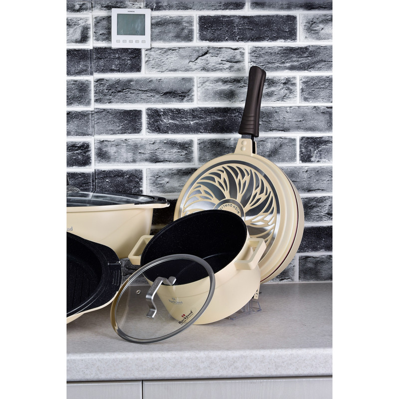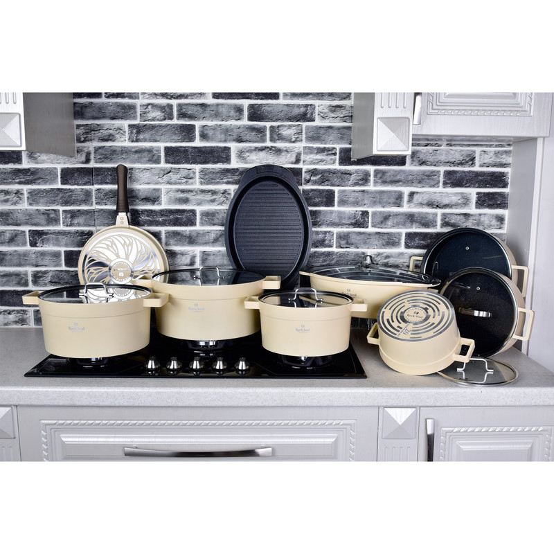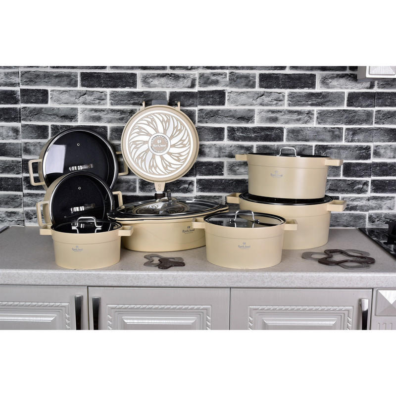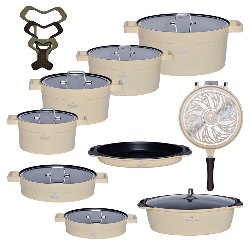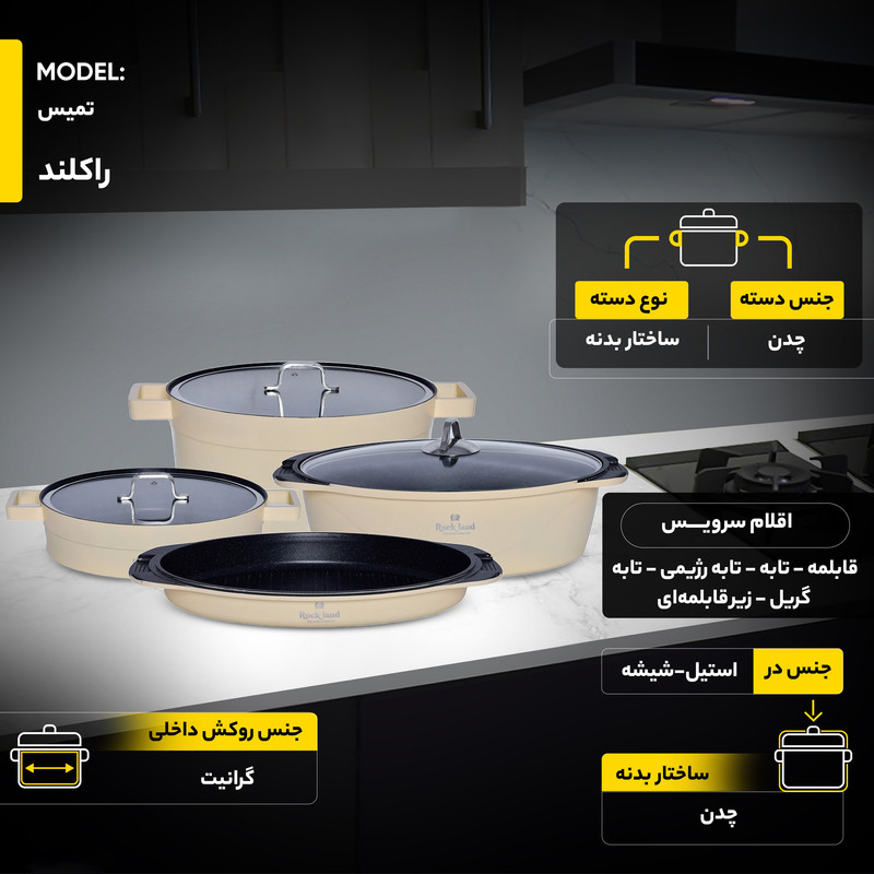 سرویس پختوپز ۲۱ پارچه راکلند مدل تمیس انتخابی کامل برای خانواده است. این مجموعه شامل چهار قابلمه با قطرهای ۲۰، ۲۴، ۲۸ و ۳۲ سانتیمتر به همراه درب شیشهای مقاوم به حرارت، دو عدد تابه دودسته در سایزهای ۲۴ و ۲۸، یک عدد تابه رژیمی گرد و یک عدد تابه بیضی مخصوص پخت مرغ یا ماهی است. همچنین در کنار این ظروف اصلی، زیرقابلمهای نیز قرار گرفته است. این محصول ساخت کشور ایران است، جنس بدنه از آلومینیوم دایکاست با ضخامت مناسب طراحی شده که در برابر ضربه و حرارت مقاوم است. سطح داخلی ظروف از گرانیت چندلایه ساخته شده و نچسب است، در نتیجه پخت غذا با کمترین روغن ممکن است. دربها از شیشه پیرکس با سوپاپ بخار طراحی و حاشیه فلزی هم باعث دوام بیشتر شده است. دستهها ثابت و از نوع مقاوم در برابر حرارت است. این سرویس با اجاق گاز، المنت برقی و اجاق سرامیکی سازگاری دارد. ظاهر مینیمال، پوشش مات و کیفیت ساخت بالا، اون رو به گزینهای مناسب برای جهیزیه و آشپزهای خوشسلیقه تبدیل کرده است.