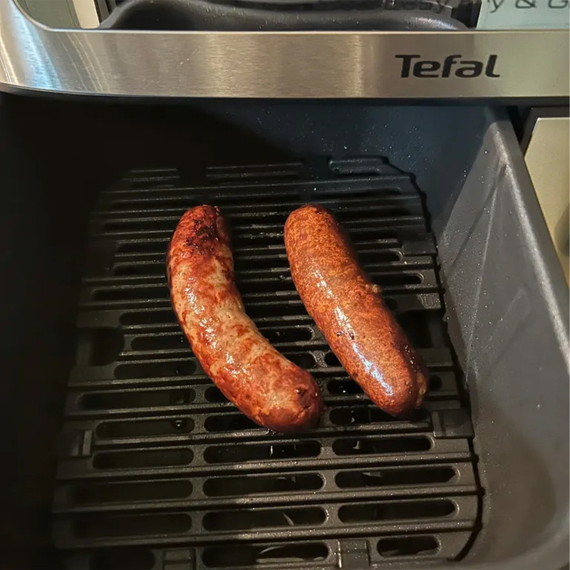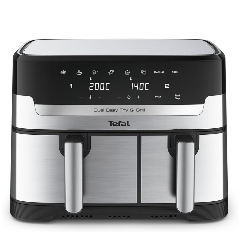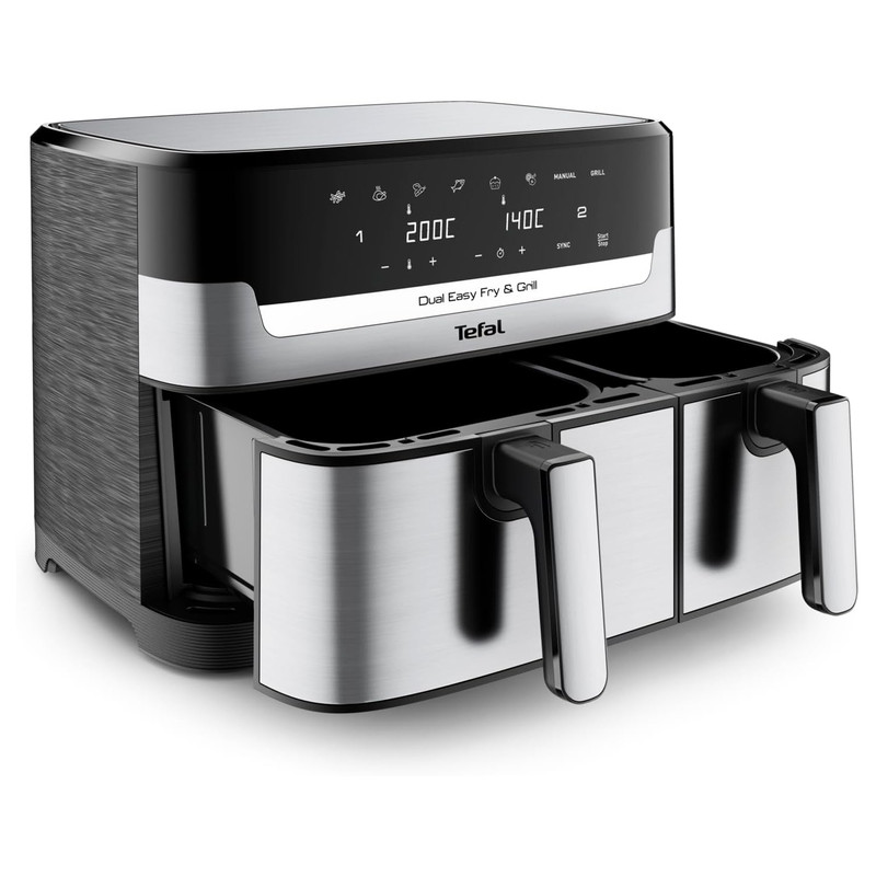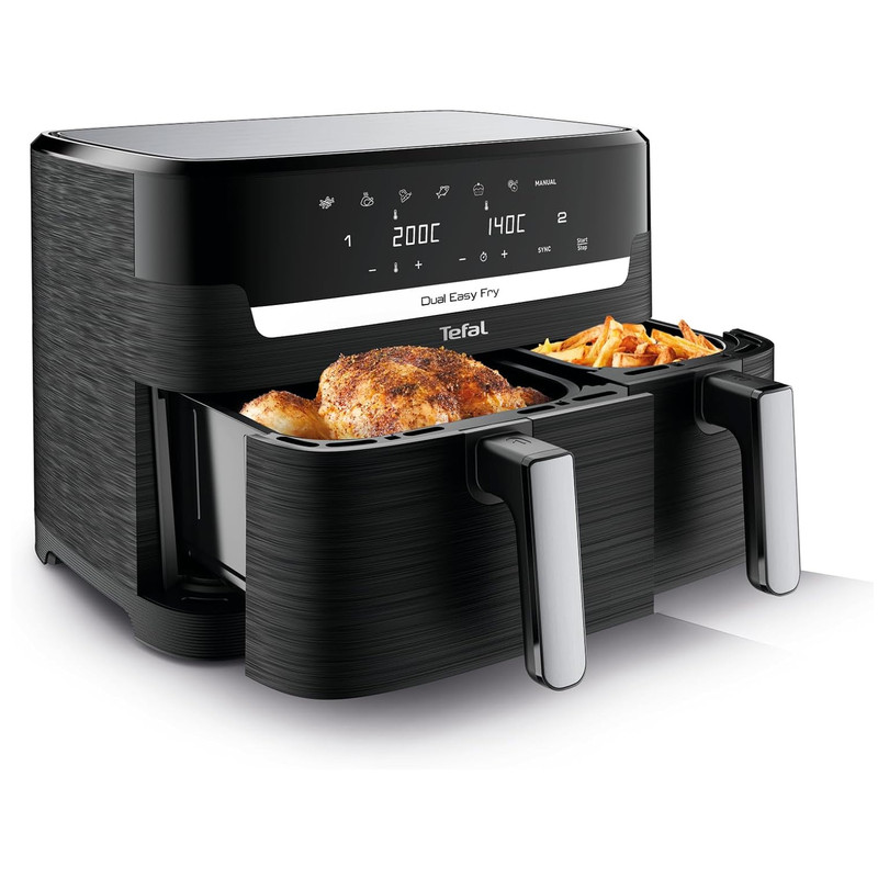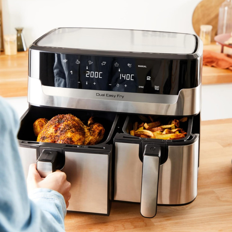 تفال EY905D40 با اولین نگاه، نوآوری و کارایی خود را به رخ میکشد. ویژگی برجستهی این مدل، طراحی دو سبدهی آن است. این دستگاه به دو کشوی پخت مجزا با مجموع ظرفیت سخاوتمندانهی ۸.۳ لیتر مجهز است که برای تهیهی غذا برای ۷ نفر یا حتی بیشتر، کاملا مناسب است. این طراحی هوشمندانه به شما اجازه میدهد تا دو نوع مادهی غذایی مختلف را به صورت همزمان و با تنظیمات دما و زمان کاملا متفاوت، بدون کوچکترین تداخل بو یا طعم، آماده کنید. تصور کنید در یک سبد، سیبزمینیهای ترد و طلایی برای کودکان و در سبد دیگر، قطعات ماهی یا مرغ گریلشدهی رژیمی برای بزرگسالان، همزمان و با کیفیتی بینقص در حال پخت هستند. بدنهی دستگاه از پلاستیک با کیفیت و مقاوم ساخته شده و با ابعاد ۴۱.۸ در ۴۰.۲ در ۳۰.۵ سانتیمتر و وزن قابل توجه ۱۱.۲ کیلوگرم، حضوری قدرتمند و در عین حال زیبا در آشپزخانهی شما خواهد داشت. پنل کنترل دیجیتال لمسی با نمایشگر LED، که به زیبایی در قسمت جلویی دستگاه جای گرفته، علاوه بر ایجاد ظاهری فناورانه و امروزی، دسترسی آسان، سریع و دقیقی به تنظیمات دما، زمان و انتخاب از میان ۷ برنامهی پخت پیشفرض را برای هر دو سبد به صورت جداگانه فراهم میکند.