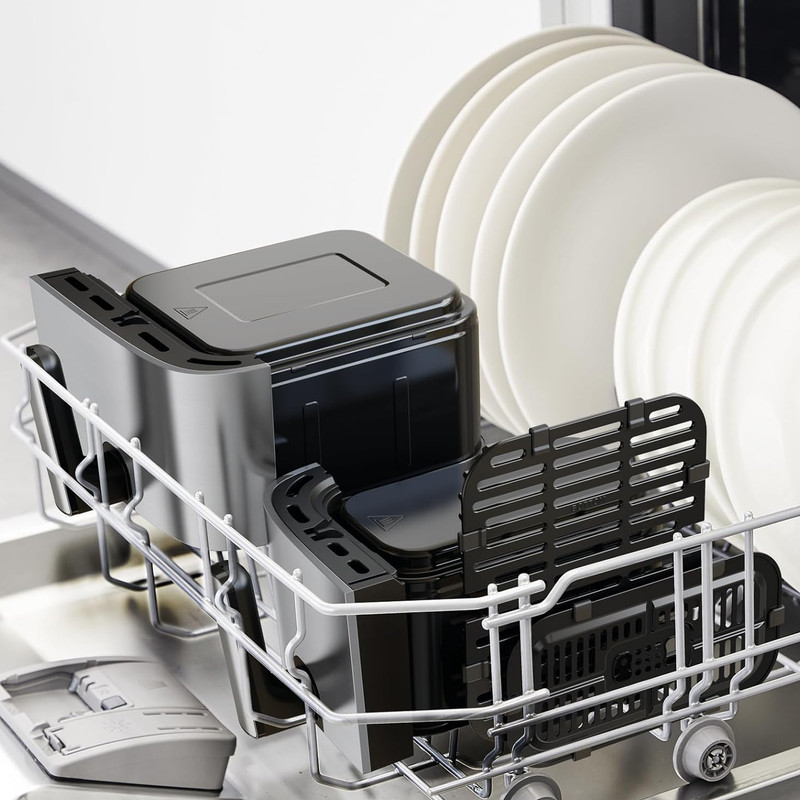 این برنامهها که به دقت برای انواع مواد غذایی و روشهای پخت مختلف تنظیم شدهاند، شامل گزینههایی برای سرخ کردن بدون روغن سیبزمینی، پخت مرغ، ماهی، گوشت، سبزیجات، پیتزا و حتی کیک میشود. قابلیت گریل کردن و یخزدایی هم از دیگر امکانات پخت این دستگاه همهکاره هستند. علاوه بر برنامههای پیشفرض، شما کنترل کاملی بر فرآیند پخت در هر دو سبد دارید. قابلیت تنظیم دقیق دما از ۵۰ تا ۲۰۰ درجه سانتیگراد و تایمر قابل تنظیم، به شما اجازه میدهد تا هر غذا را دقیقا مطابق با دستور پخت و سلیقهی خودتان آماده نمایید. اما ویژگی انقلابی و بسیار کاربردی این مدل، قابلیت SYNC یا همان هماهنگسازی اتمام پخت است. با استفاده از این قابلیت، شما میتوانید دو غذای مختلف را با زمانها و دماهای پخت متفاوت در دو سبد مجزا قرار دهید و دستگاه به صورت هوشمند، زمان شروع پخت هر سبد را طوری تنظیم میکند که هر دو غذا دقیقا در یک زمان آمادهی سرو شوند. این ویژگی، برنامهریزی برای تهیهی یک وعدهی غذایی کامل و متنوع را بسیار آسان و بیدردسر میکند.