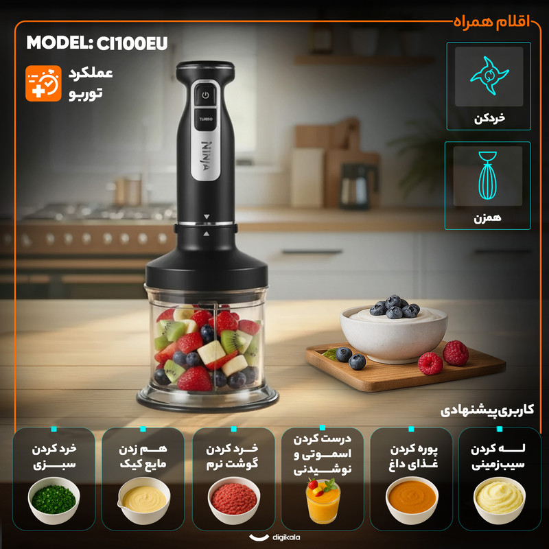 گوشت کوب برقی نینجا مدل CI100UK یک دستگاه چندکاره حرفهای با توان 850 وات است که قابلیت خرد کردن، هم زدن و له کردن انواع مواد غذایی را دارد. این محصول با طراحی ارگونومیک و جنس استیل ضد زنگ، شامل سه عملکرد اصلی: خردکن 700 میلیلیتری، گوشت کوب و همزن حرفهای با 5 سرعت مختلف است. ویژگیهایی مانند پایه ضد لغزش، عملکرد یخ خردکن و تکنولوژی Anti Splash آن را به گزینهای مناسب برای آشپزخانههای مدرن تبدیل کرده است. قطعات این دستگاه بهجز بخش اصلی، قابل شستشو در ماشین ظرفشویی هستند و با طراحی شیک و جمعوجور، فضای کمی اشغال میکند.